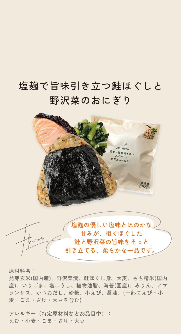アレルギー(特定原材料など28品目中):小麦・牛肉・ごま・大豆・鶏肉・りんご塩麹で旨味引き立つ鮭ほぐしと野沢菜のおにぎり