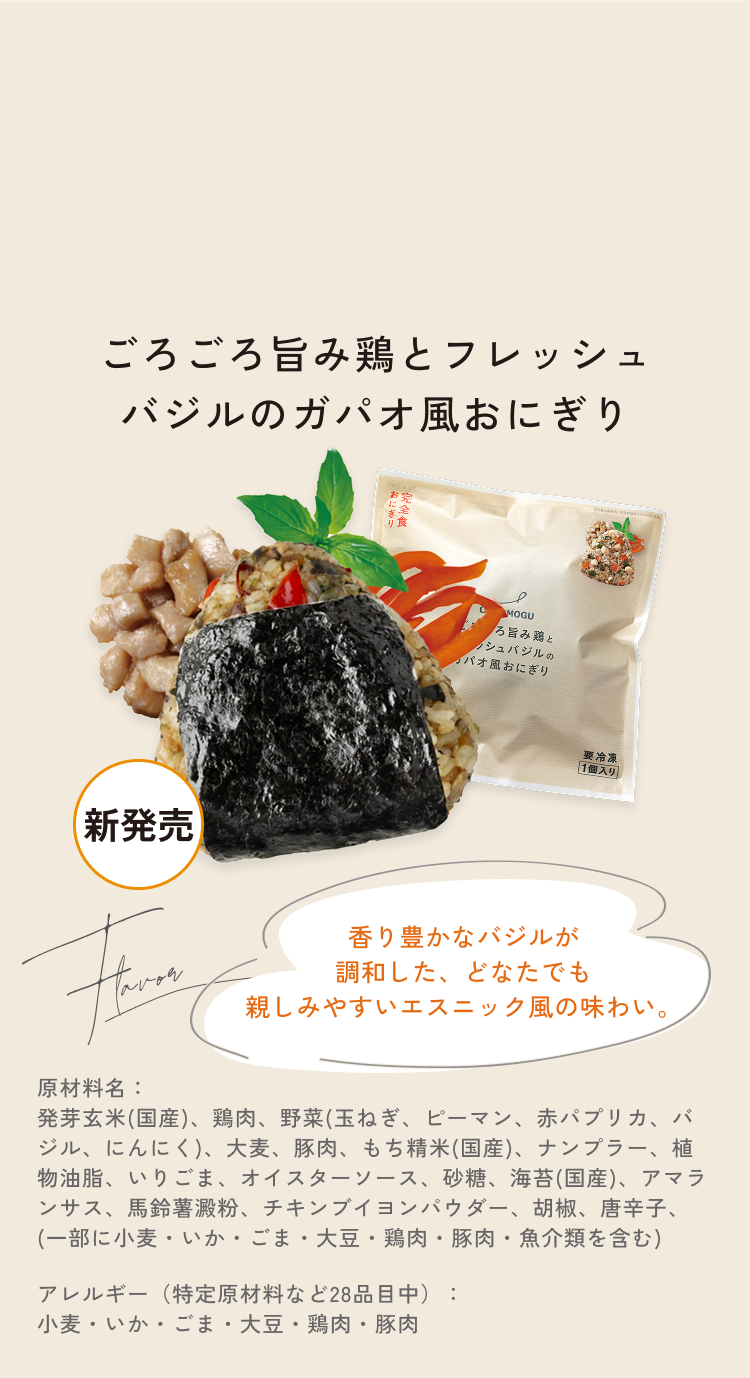 アレルギー(特定原材料など28品目中):えび・小麦・ごま・さけ・大豆ごろごろ旨み鶏とフレッシュバジルのガパオ風おにぎり