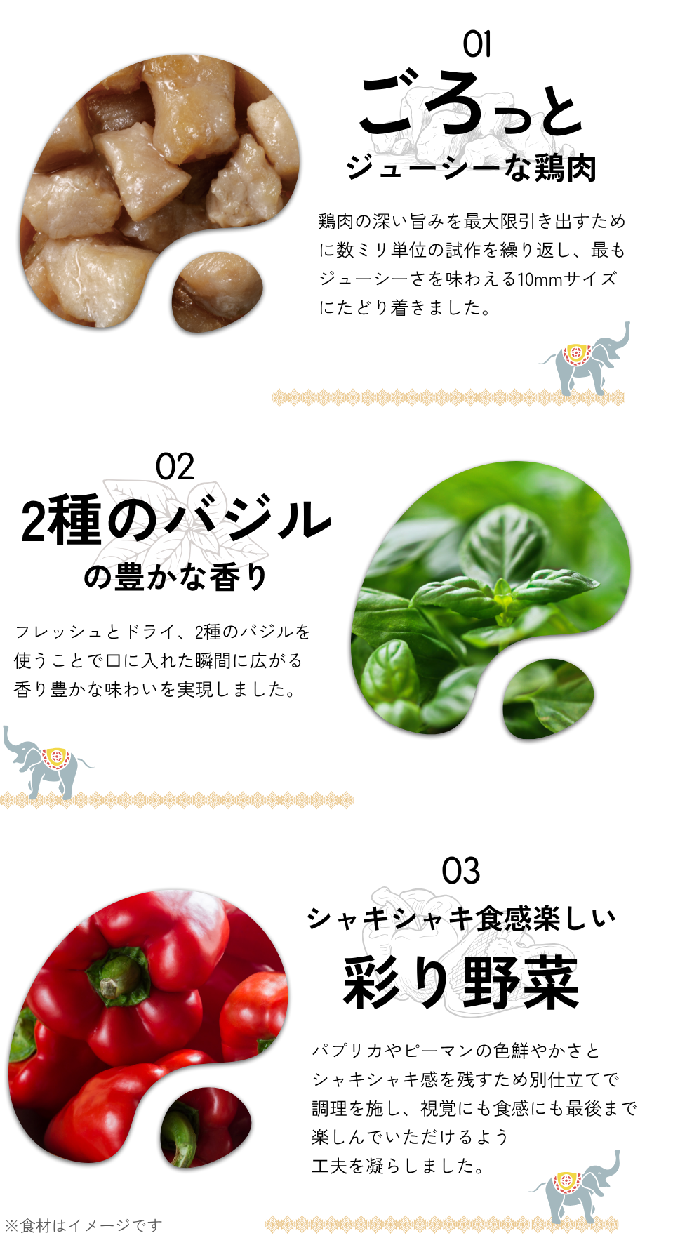 さらに、2種のバジルが織りなす爽やかな香りと、パプリカやピーマンの彩り野菜のシャキシャキ食感が加わり、味わいに奥行きと楽しさをプラス。