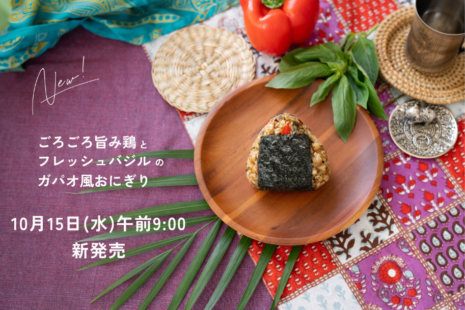 2025年10月15日(水)午前9:00より、新商品「ごろごろ旨み鶏とフレッシュバジルのガパオ風おにぎり」が販売開始となります!