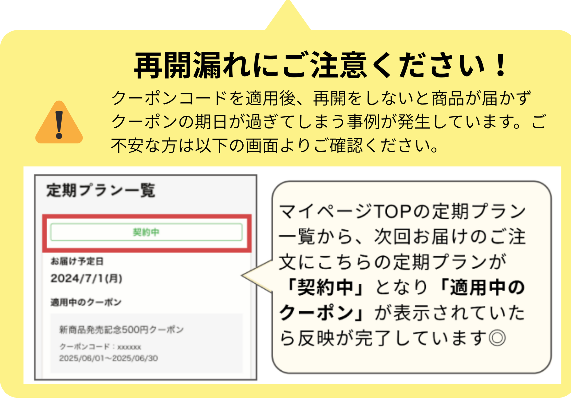 - クーポンコードの入力だけでは再開はできません。必ず 定期プランの再開手続き を完了してください。